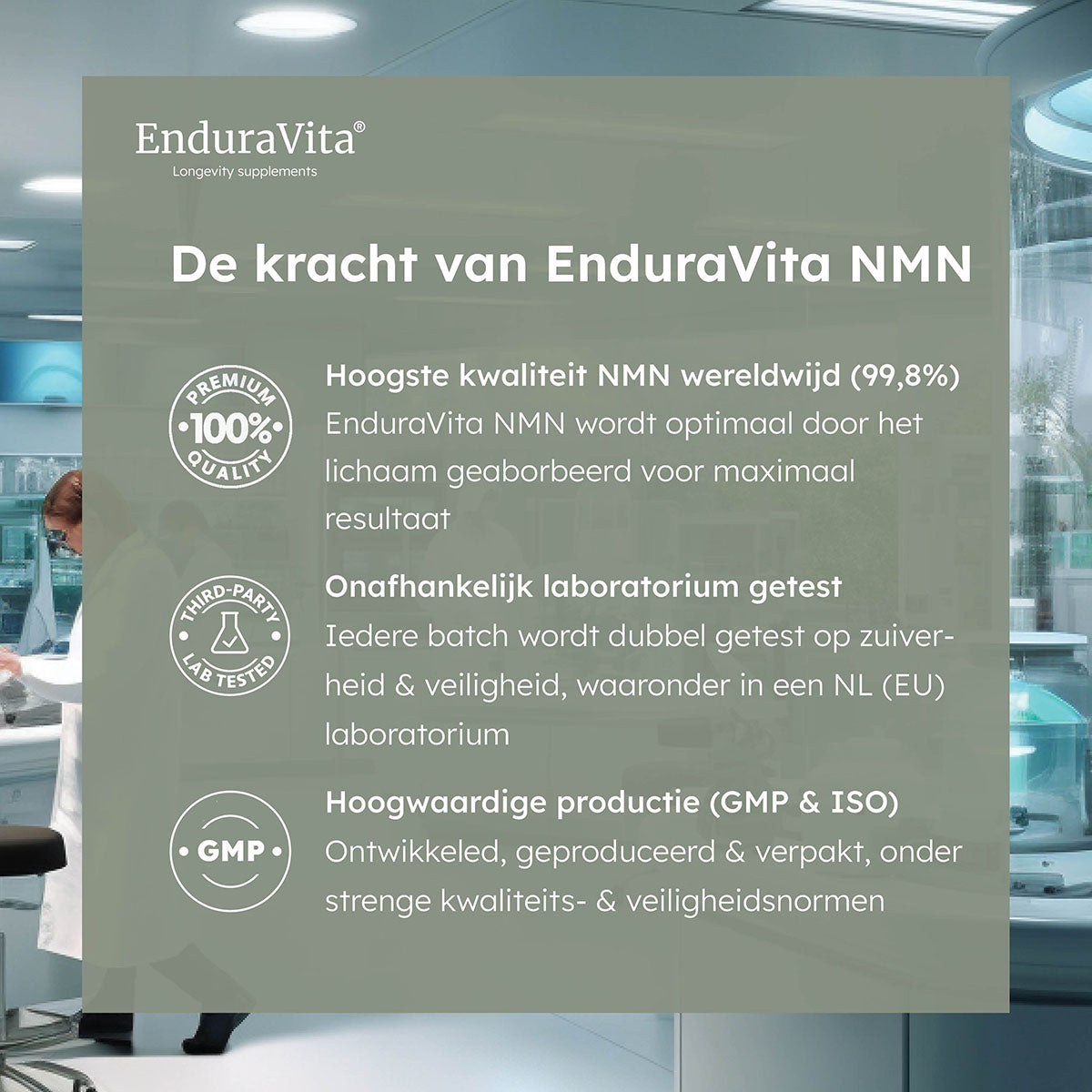 Our NMN boasts the highest possible purity of an impressive 99.8%. This ensures perfect absorption by the body. EnduraVita's NMN is produced according to all important ISO standards regarding safety. Additionally, the NMN undergoes double testing in laboratories for quality, consistency, and safety, including a laboratory in NL(EU).